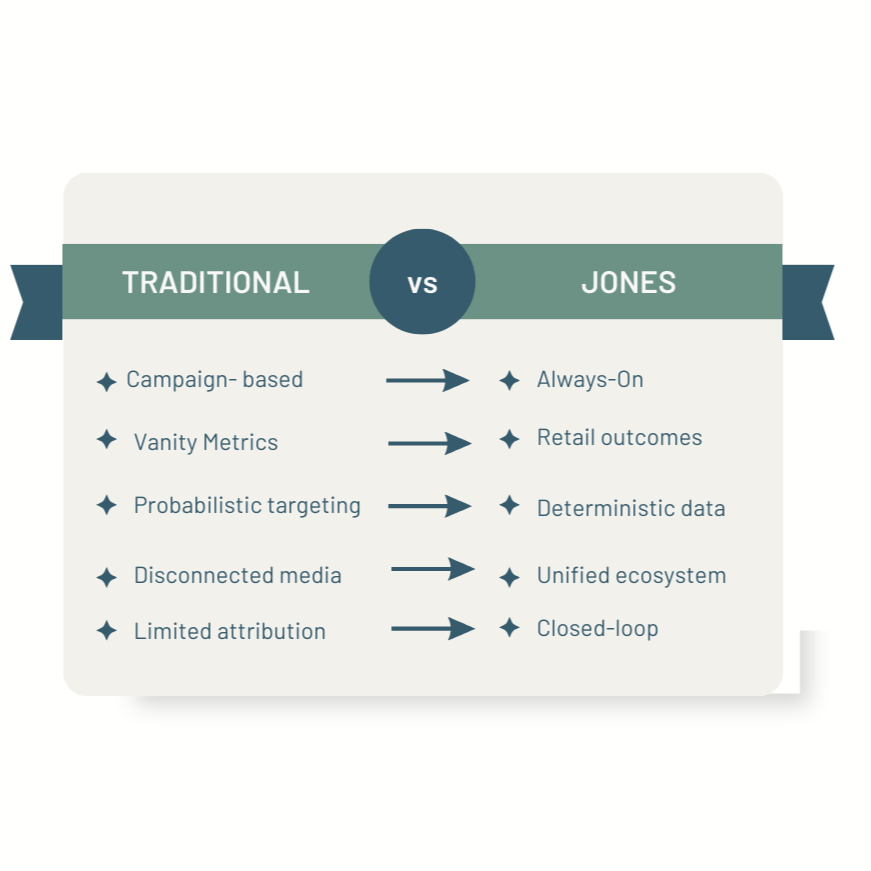 JONES brings together creator engagement, deterministic shopper data, and precision media activation into one unified system that drives measurable retail outcomes.